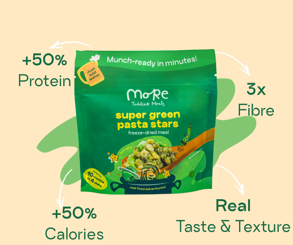 Blast off to flavour town with super greens pasta stars! Featuring fun star-shaped pasta twinkling in a galaxy of cheesy pea, courgette, basil, and mint puree, this meal is a veggie-packed voyage that’s out of this world. Tasty green beans add the perfect crunch to fuel your little astronaut’s next big adventure. Freeze-dried for convenience and stellar freshness, it’s mealtime made easy—just add water and let the cosmic magic happen. Ready, set... yum!